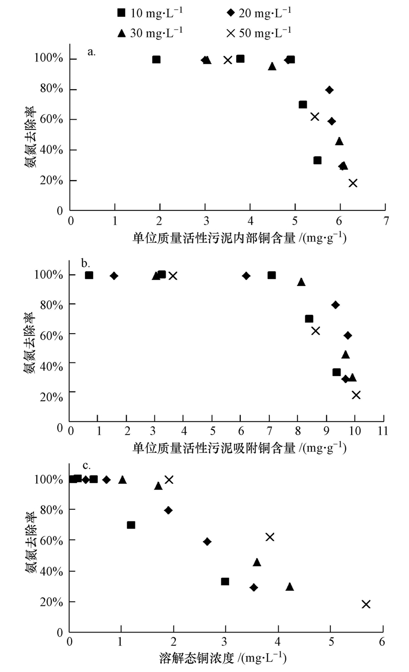 圖 6 不同形態(tài)的銅和氨氮去除率的相關(guān)性(a.活性污泥內(nèi)部的銅;b.活性污泥吸附的銅;c.溶解態(tài)的銅)