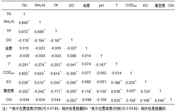 F1的方差貢獻率31.37%,表征因子為TN、NH3-N、TP和CODMn,代表營養(yǎng)物質(zhì)和耗氧有機物污染,主要來自城市居民生活及餐飲旅游等第三產(chǎn)業(yè)污水的排放.F2的方差貢獻率20.36%,表征因子為DO、T、藻密度和Chl,DO與T、藻密度和Chl呈負(fù)相關(guān),T與藻密度和Chl呈正相關(guān),代表生物化學(xué)污染,主要來至自然因素與人為排放的營養(yǎng)物質(zhì)相互作用造成水體富營養(yǎng)化污染進而導(dǎo)致藻類爆發(fā).F3的方差貢獻率10.55%,表征因子為EC.