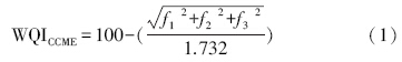 CCME WQI模型由加拿大環(huán)保部開發(fā),該水質(zhì)指數(shù)與其它水質(zhì)指數(shù)相比具有運算簡單、參數(shù)設(shè)定可以結(jié)合研究區(qū)水質(zhì)保護提升目標(biāo)而設(shè)定的特點.模型根據(jù)輸入水質(zhì)監(jiān)測數(shù)據(jù)將采樣點水質(zhì)歸一化到0到100之間,并根據(jù)水體污染的程度,從0~100將水質(zhì)由差到極好劃分為5類,分別對應(yīng)差(0~44):水環(huán)境遭到持續(xù)性的威脅和破壞;及格(44.1~64):水環(huán)境遭到頻繁的威脅和破壞;一般(64.1~79):水環(huán)境偶爾遭到威脅和破壞;好(79.1~94):水環(huán)境得到保護只是遭到小范圍的威脅和破壞;極好(94.1~100):水環(huán)境得到完善的保護.具體計算公式為: