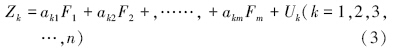 式中,Zk表示第k個變量的標(biāo)準(zhǔn)化分?jǐn)?shù),akm表示第m個因子相對于第k個變量的因子載荷,F(xiàn)m表示第m個公共因子,Uk為Zk的唯一因素,m表示所有變量公共因子的數(shù)目,n表示變量的個數(shù).