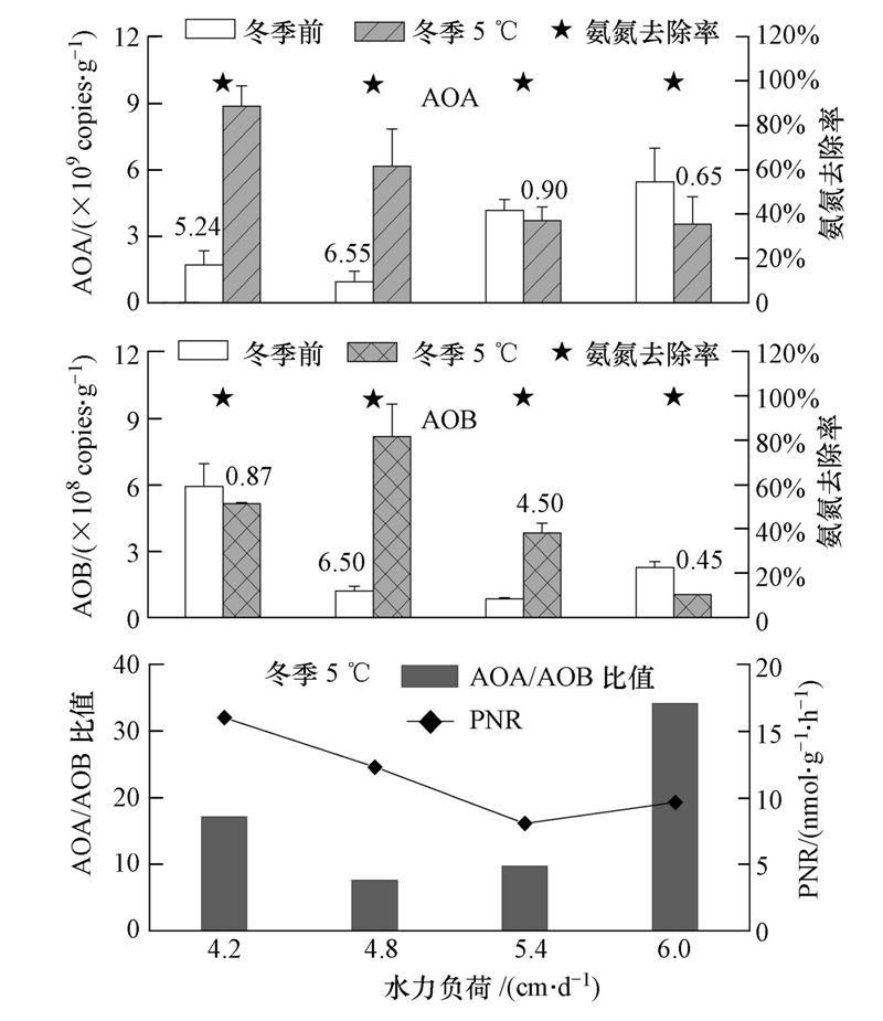 圖 2 不同水力負荷下濕地中AOA、AOB中amoA基因豐度及PNR(圖中數值為冬季5 ℃與冬季前AOA和AOB比值)