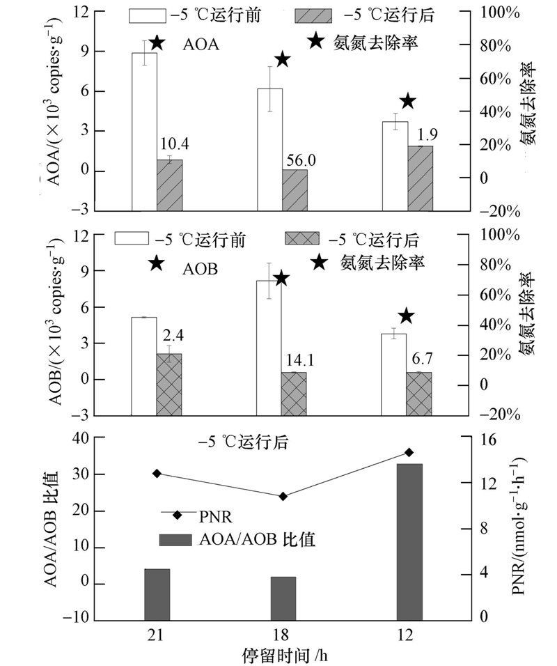 圖 3 不同停留時間濕地系統中AOA、AOB中amoA基因豐度及PNR(圖中數值-5 ℃運行前與-5 ℃運行后AOA、AOB比值)
