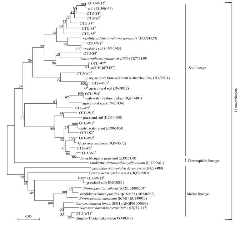 濕地系統在低溫條件下間歇運行后,土壤多樣性發生了變化,可看出明顯的季節性差異.其中夏季樣品全部屬于土壤支系,75%的序列(5個OTU)與中度嗜溫菌C and idatu Nitrososphaera gargensis相似度較高.而冬季樣品各個OTU差異度較高,其中11個OTU屬于土壤支系,土壤支系中OTU-W8#和OTU-W12#與中度嗜溫菌C and idatu Nitrososphaera gargensis相似度達89%和92%,OTU-W7#與Nitrososphaera viennensis EN76相似度達89%,同時還產生很多新的支系,可能屬于一些還未被定義的新古菌;還2個OTU屬于海洋水體支系,其中OTU-W11#與來自根際土壤的Nitrosoarchaeum koreensis MY1相似度高達95%,OTU-W11#和OTU-W13#和來自海洋的Nitrosopumilus maritimus相似度達90%和81%.