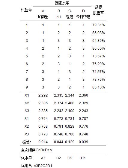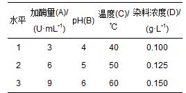 為確定漆酶催化酸性黑ATT脫色的最佳條件,對加酶量、pH、溫度、染料濃度進行正交優化試驗,選用L9(34)正交表安排試驗,各因素的試驗水平根據單因素的試驗結果確定,具體見表 1.
