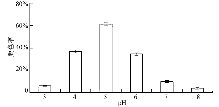 在加酶量6 U · mL-1、溫度60 ℃、染料濃度0.1 g · L-1條件下,分別調節緩沖液pH為3、4、5、6、7、8,保溫60 min.研究pH對漆酶催化酸性黑ATT脫色的影響,結果(圖 3)表明,當pH為3~8時,隨著pH的增大,脫色率呈先上升后下降的趨勢,pH為5時脫色效果最好.pH是影響酶活的主要因素之一,對酶活的影響關系到酶作用于染液的效果,而漆酶的酶活在偏酸的環境中較高,在酸性條件下有利于漆酶催化酸性黑ATT脫色.G.lucidum所產漆酶適應的pH范圍較寬,在pH 4.0~7.5酶活穩定,pH 4.0對偶氮染料Remazol Black-5和蒽醌染料Remazol Brilliant Blue R的脫色效果最好.