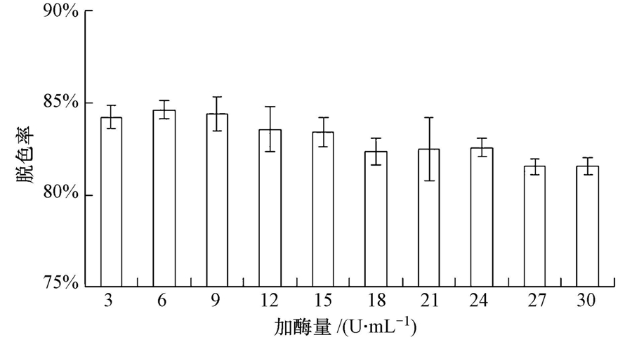 在pH 5.0、溫度60 ℃、染料濃度0.1 g · L-1條件下,分別加入3~30 U · mL-1酶量,保溫60 min,研究加酶量對漆酶催化酸性黑ATT脫色的影響.結果如圖 5所示,在小于6 U · mL-1的酶活范圍內,隨著加酶量的增加,脫色率與加酶量成正相關,隨著酶的增多,反應活性中心增多,有利于與底物的結合從而提高脫色的效率,加酶量在6 U · mL-1時脫色率為84.62%,但繼續增加酶量并不能進一步顯著提高脫色率,這一結果與Murugesan等的結果相一致.