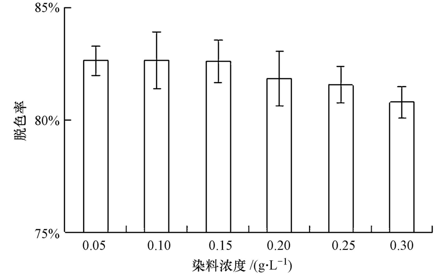 在pH 5.0、加酶量6 U · mL-1、溫度60 ℃條件下,分別添加濃度為0.05、0.10、0.15 g · L-1、0.20、0.25、0.30 g · L-1的酸性黑ATT染料,保溫60 min,比較一定量的酶液脫色的染料濃度限度.如圖 6所示,在染料濃度為0.05~0.30 g · L-1時,脫色效果呈下降趨勢,但脫色率相差不大,都在80%以上,表明G. lucidum wz-32所產漆酶能耐受較高濃度的酸性黑ATT染料.提高染料濃度在前期脫色率較低,但隨著反應時間的延長,脫色率會逐漸上升,偶氮染料Remazol Black-5和蒽醌染料Remazol Brilliant Blue R在0.3 g · L-1濃度下對漆酶沒有抑制作用.酸性黑ATT中含有磺酸基(—SO3),磺酸基對染料的生物降解有一定的抑制作用.