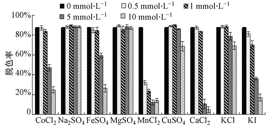 紡織廢水中往往含有Cu2+、Co2+、Zn2+、Na+等金屬離子,為探究各離子對脫色效果的影響,在正交試驗所得的最優條件下分別添加氯化鈷、硫酸鈉、硫酸亞鐵、硫酸鎂、氯化錳、硫酸銅、氯化鈣、氯化鉀、碘化鉀,濃度分別為0、0.5、1、5、10 mmol · L-1.結果表明,對脫色作用具有促進作用的離子有:Na+、Mg2+、Cu2+,但在試驗范圍內促進作用不顯著;具有抑制作用的離子有Co2+、Fe2+、Mn2+、Ca2+、I-(圖 7),10 mmol · L-1的濃度可使脫色率降低50%以上;其中Mn2+的抑制作用尤為顯著,0.5 mmol · L-1的濃度就使脫色率減小50%以上.通過KCl和KI的比較試驗,可以看出,I-濃度為10 mmol · L-1時脫色率只有17.01%,具有很強的抑制作用,因為I-可以抑制酶活,從而降低脫色率.