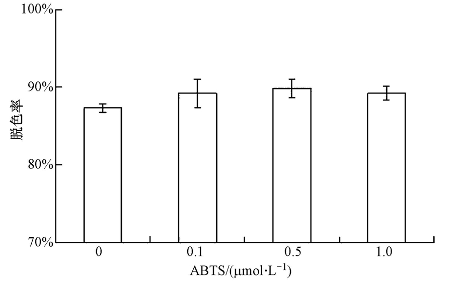銅離子在濃度小于1 mmol · L-1時,對脫色略有促進作用,而隨著銅離子濃度的上升,脫色率明顯下降.Cu2+是漆酶的組成部分,也是其活性中心,適量的Cu2+對漆酶的活性有促進作用.但是高濃度銅離子卻會起反作用,因為高濃度離子對染料本身的色澤起了加深作用.