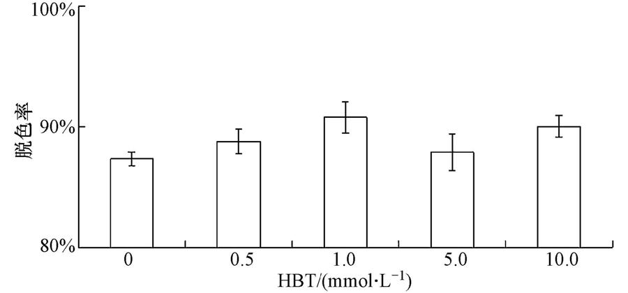 分別在脫色體系中加入0、0.1、0.5、1.0 μmol · L-1 濃度的ABTS,0、0.5、1、5、10 mmol · L-1濃度的HBT,探究脫色助劑對脫色率的影響.結果(圖 9、10)表明,在試驗范圍內ABTS對脫色影響不顯著;但HBT效果顯著,室溫下加入1 mmol · L-1 HBT反應10 min,其脫色率可達到對照組(50 ℃)反應60 min時的脫色率(87.35%),顯著提高了漆酶的脫色效率.HBT是良好的氧化還原介質,在漆酶催化染料脫色、紙漿漂白及其它污染物降解過程中起著重要作用的研究表明HBT是Pleurotus sajor-caju和G. lucidum所產漆酶脫色的最佳助劑.漆酶-HBT介質系統對降 解Acid Red 1、Reactive Black 5、reactive red 239、reactive yellow 15、reactive blue 114等染料非常有效. HBT濃度為1.0 mmol · L-1時效果最佳(脫色率可達90.81%),濃度大于1.0 mmol · L-1以后促進作用反而降低(圖 10),因為HBT超過一定濃度時,其形成的自由基對漆酶的酶活有抑制作用.具體參見污水寶商城資料或http://www.bnynw.com更多相關技術文檔。
