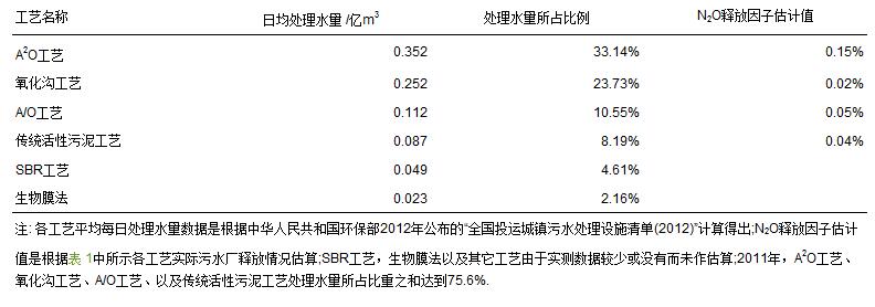 關(guān)于比較不同工藝實(shí)際污水廠N2O的釋放情況,并分析其產(chǎn)生差異原因的研究還未見(jiàn)報(bào)道.本文初步比較和分析了實(shí)際污水廠幾種典型工藝的N2O釋放情況,并首次從區(qū)別不同污水處理工藝角度,估算了全國(guó)污水廠的N2O釋放總量.