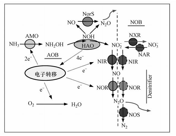 圖 1 AOB,NOB和反硝化菌的氮轉(zhuǎn)化途徑