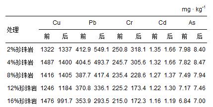 經(jīng)反應器處理后,混合物和蚯蚓體內(nèi)的重金屬含量發(fā)生了一定的變化.如表 3所示,當珍珠巖添加比例在8%以上時,處理后重金屬Cu、Pb和Cr含量均表現(xiàn)為降低;處理后Cd和As含量有所升高,但變化不明顯.此外,從表 3中的數(shù)據(jù)分析可知,珍珠巖添加比例對混合物中重金屬含量的減少也有一定的影響,大致可概括為隨著珍珠巖比例的增加,污泥中重金屬含量的減幅也越大,其原因同樣可能是因為污泥物理結構的改變改善了蚯蚓的生長環(huán)境,繼而促進了蚯蚓對重金屬降低的直接和間接作用.
