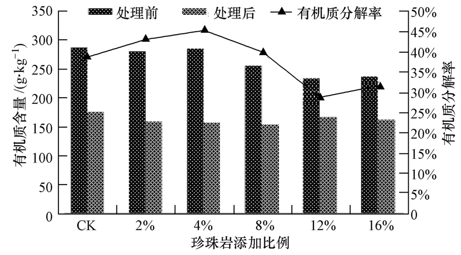 圖 2 不同比例珍珠巖處理混合物有機質(zhì)減量化情況