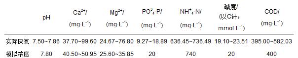 實驗采用自來水溶解KH2PO4、NH4Cl、NaHCO3、CH3COOH模擬某污水處理廠厭氧消化上清液,其中CH3COOH用以模擬消化液中的有機物,NaOH用以調節(jié)模擬水pH值在7.8左右,自來水中的Ca2+、Mg2+用以模擬原消化液中的Ca2+、Mg2+濃度,NaNO3則控制溶液離子強度在0.01左右,各物質配制濃度見表 1.實驗中所使用藥劑均為分析純.