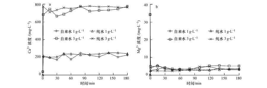 白云石石灰由石家莊東方礦業(yè)提供,其中CaO含量為40%~50%,MgO含量為35%~40%.實驗中稱取1 g和3 g粒徑為100目的白云石石灰各兩份,分別投加到含1 L純水與自來水的燒杯中,于六聯(lián)攪拌機150 r · min-1的轉速下攪拌溶解3.0 h.為了考察不同溶劑體系中白云石石灰釋放Ca2+、Mg2+的能力,在溶解開始0、15、30、45、60、80、100、120、140、160、180 min時間點取樣,每次取樣5 mL,用于測定Ca2+、Mg2+濃度,取樣的同時記錄反應體系的pH值和堿度變化.