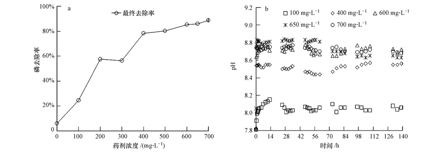 采用單因子考察法,選用的白云石石灰顆粒粒徑為100目.首先,考察藥劑投加量影響,實驗中固定水力停留時間(HRT)為5.0 h,曝氣量為200 mL · min-1,設計了9個藥劑濃度:0、100、200、300、400、500、600、650、700 mg · L-1,通過對比磷去除率選出適宜的藥劑投加量;其次,考察停留時間影響,設定HRT分別為3.0、4.0、5.0、6.0、7.0、8.0 h,對比選出較佳HRT;最后,考察曝氣量為50、100、200、300、400 mL · min-1下磷的去除效果,以確定較佳曝氣量.進藥流量設定為進水流量的10%.實驗水溫為室溫.