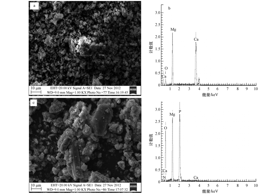 對白云石石灰和較佳藥劑投加量下的固體產物進行了SEM-EDX分析.從圖 6可知,沉淀晶形為斜方型或棍狀,且形態(tài)粗大,表面還附著有少量無定形沉淀顆粒,通過相應的EDX分析,產物中Mg/P/O的摩爾比約為1 ∶ 1.05 ∶ 3.77,與MAP中的Mg/P/O=1 ∶ 1 ∶ 4極為接近,因此初步判斷所得晶體為MAP晶體,但由于Ca2+及CO2-3等雜質的存在,改變了MAP晶體的形態(tài)并降低了晶體的純度(Cao et al., 2008;袁鵬等,2007).