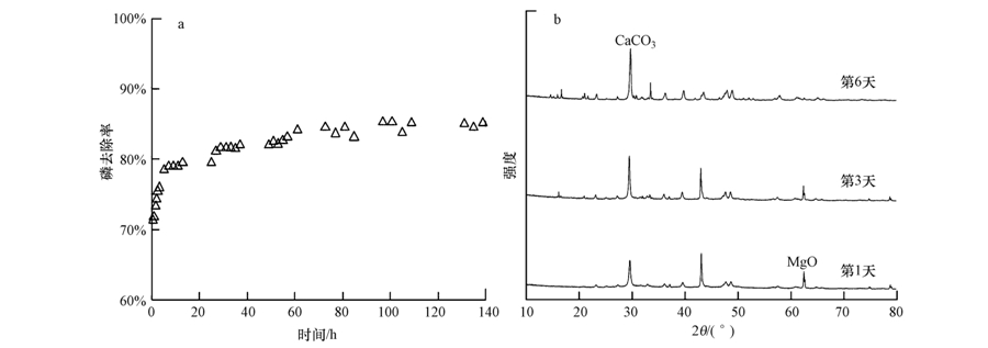 圖 9 HRT 5.0 h不同運行時間段的去除率(a)及沉淀產物的XRD圖譜(b)