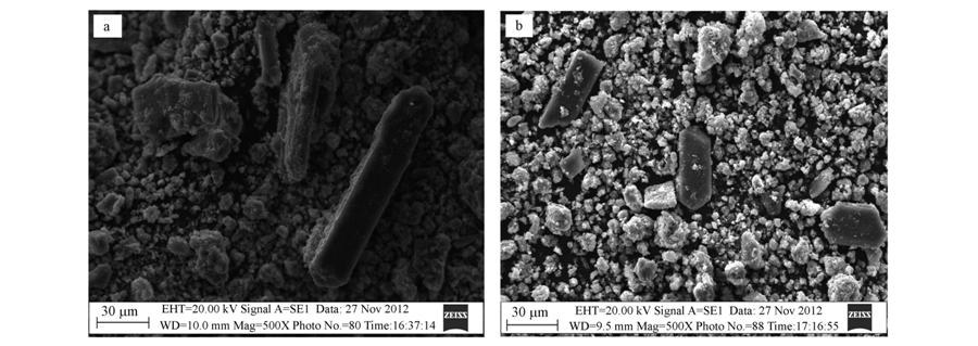圖 10 曝氣量50 mL · min-1(a)與400 mL · min-1(b)產物SEM照片(×500)