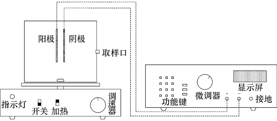 裝置為圓柱形有機玻璃反應器(內徑12 cm,高度10.2 cm),有效容積1 L,取樣口距底部6 cm.陽極材料為鉭襯底BDD電極,陰極材料為AISI 201不銹鋼,兩電極豎直放置于裝置中間.兩個電極的有效面積均為29.25 cm2,極板間距可調.試驗所需電流由美爾諾M8872型可編程直流電源(電流0~35 A、電壓0~30 V)提供;采用磁力攪拌器保證榨菜廢水混合均勻.試驗裝置示意圖見圖 1.所有試驗均在恒定電流狀態下進行,試驗過程中溫度不作調節.