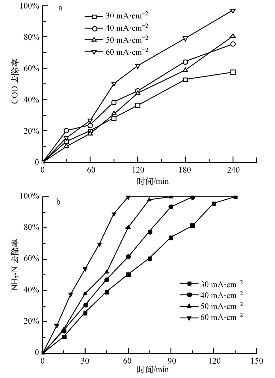 電流密度決定了電化學氧化過程中羥基自由基(· OH)的產生量,是影響電化學氧化過程的主要參.在稀釋比1 ∶ 2、pH值未調節、極板間距為10 mm的條件下,考察電流密度分別為30、40、50、60 mA · cm-2時對BDD電極電化學氧化榨菜廢水COD、NH3-N去除率的影響,結果如圖 3所示.由圖 3a可知,增大電流密度能夠提高榨菜廢水的COD去除率,這與利用BDD電極處理垃圾滲濾液時的現象一致.電流密度從40 mA · cm-2變為50 mA · cm-2時,COD去除率變化不大;當電流密度為60 mA · cm-2時,電化學氧化240 min時COD去除率為97%.在試驗電流密度條件下,COD去除率基本呈線性變化,說明BDD電極電化學氧化榨菜廢水是受電流密度控制.電化學氧化垃圾滲濾液的結果也表明,在所有試驗電流密度時COD去除率呈現線性變化.這是由于BDD電極表面產生的· OH是一種無選擇性的強氧化劑,能夠氧化大部分有機物.電流密度的大小決定了· OH、活性氯的產生量,· OH、活性氯均可以氧化有機物,電流密度為30、40、50、60 mA · cm-2時電化學氧化過程單位時間內羥基自由基產生量分別為2.97×10-4、3.05×10-4、3.11×10-4、3.14×10-4 mmol · L-1 · min-1,因此,提高電流密度能夠提高COD去除率.
