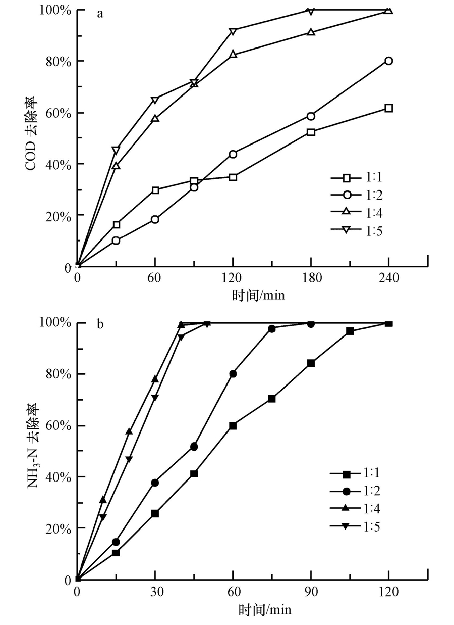 3.3 稀釋比對COD、NH3-N去除率的影響