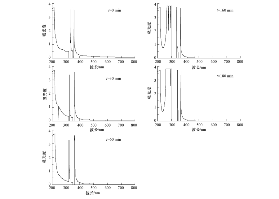 在電流密度50 mA · cm-2、稀釋比1 ∶ 2、pH未調節、極板間距15 mm的最優工況條件下進行BDD電極電化學氧化榨菜廢水試驗,不同電解時間時處理出水在波長200~800 nm下的紫外-可見吸收光譜如圖 6所示.由圖 6可知,不同電解時間出水的波形與原水的波形相比發生了改變,可以認為有中間產物生成;隨著電解時間的延長,波長大于473 nm的吸光度值呈現逐漸降低趨勢,可初步認定部分有機物與羥基自由基或活性氯發生反應直至礦化;波長472 nm處出現明顯的特征峰.對于電化學氧化過程中有機物的變化還需通過GC-MS進行定性分析.