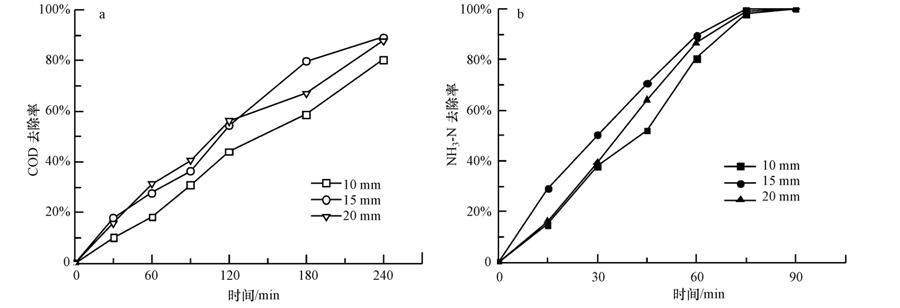 當電流密度為50 mA · cm-2、稀釋比為1 ∶ 2、pH未調節時,極板間距(10、15、20 mm)對BDD電極電化學氧化榨菜廢水的COD、NH3-N去除率影響如圖 5所示.由圖 5a可知,當極板間距為15、20 mm時,COD去除率比極板間距為10 mm時略高.利用活性炭三維電極處理榨菜廢水的結果表明,COD去除率隨極板間距的增大呈先增大后降低的趨勢.造成這一差異的原因可能是由于電極材料的不同所致.由圖 5b可知,當極板間距為15 mm時,BDD電極電化學氧化榨菜廢水的NH3-N去除率比其它極板間距時要高;增大極板間距對于完全去除榨菜廢水中NH3-N所需的時間無影響.增大極板間距能夠提高COD、NH3-N去除率的原因可能是減少了H2與Cl2發生的副反應,Cl2在溶液中發生歧化反應生成更多的活性氯.綜合考慮COD、NH3-N的去除率及能耗,確定BDD電極電化學氧化榨菜廢水的最適宜極板間距為15 mm.