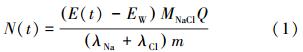 式中,N(t)為標(biāo)準(zhǔn)化的停留時間分布密度(h-1),E為電導(dǎo)率(mS · m-1),MNaCl為NaCl摩爾質(zhì)量(g · mol-1),Ew為進(jìn)水背景電導(dǎo)率(mS · m-1),λNa為Na+離子的摩爾電導(dǎo)率(S · m2 · mol-1),t為從示蹤實(shí)驗(yàn)開始的時間(h),λCl為Cl-離子的摩爾電導(dǎo)率(S · m-2 · mol-1),Q為流量(m3 · h-1),m為加入的示蹤劑總量(g).