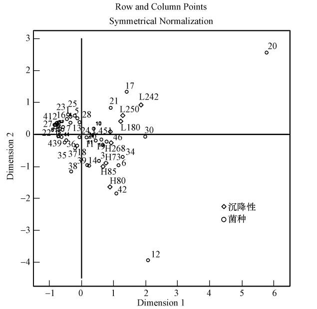 為研究污泥沉降性與微生物菌群結構的關系,我們對兩者進行了對應分析(Correspondence analysis),結果如圖 6所示.圖中樣品名稱中字母H和L分別表示25 ℃和15 ℃反應器,其后的數字表示污泥的SVI值.當溫度較低時,污泥沉降性較差,與低溫和較差的沉降性關系密切的優勢菌共9種,依次為條帶30(α-變形菌),19、20(β-變形菌),10、11(γ-變形菌),21、26(擬桿菌門),17、46(放線菌門),主要為變形菌門(Proteobacteria)、擬桿菌門(Bacteroidetes)和放線菌門(Actinobacteria).之前的研究者們采用熒光原位雜交(FISH)技術證實0041型絲狀菌是一種β-變形菌,而Thiothrix II 是一種γ-變形菌(Thomsen et al.,2006; Rossetti et al.,2003).可以推斷低溫環境同時刺激了這些優勢菌和絲狀菌的生長,而這種環境究竟如何影響Thiothrix II的生長及在此過程中上述9優勢菌究竟有何作用仍需要進一步的研究.高溫時,污泥沉降性良好,受高溫影響較大的優勢菌有7種,依次為條帶34(變形菌門)、3(綠彎菌門)、39(α-變形菌)、14(α-變形菌)、6(擬桿菌門)、42(擬桿菌門)和12(擬桿菌門),主要屬于變形菌門(Proteobacteria)和擬桿菌門(Bacteroidetes).前人的研究表明,活性污泥絮體中大多數細菌均屬于變形菌門和擬桿菌門(Bacteroidetes),它們在污染物的去除過程中發揮著重要作用.在高溫系統中,這些細菌的優勢生長伴隨著污泥沉降的逐漸好轉,可以推測它們應該是菌膠團細菌的重要組成部分.此外,有研究指出,高溫有利于厚壁菌門細菌的生長.然而在本實驗中,高溫對厚壁菌門細菌的影響并不明顯.具體參見污水寶商城資料或http://www.bnynw.com更多相關技術文檔。