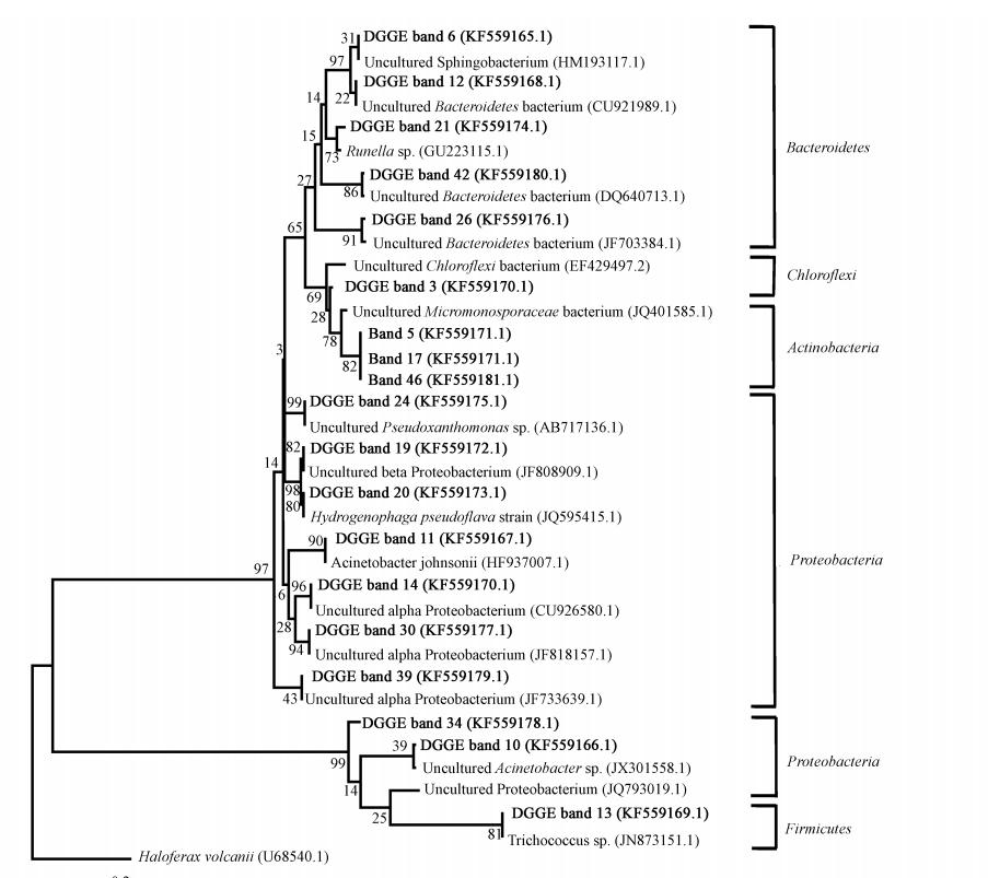 圖 5所示為受溫度影響較大的優勢菌的系統發育樹.在所有活性污泥樣品中,受溫度影響較大的優勢細菌有19種,其中以變形菌最多,共9種(α-、β-和γ-變形菌分別為3種、2種和3種);其次是擬桿菌門,共5種;再次為放線菌門,共3種;最后是綠彎菌門和厚壁菌門,各1種.本試驗所得序列與GeneBank數據庫中序列的比對結果顯示,系統中一半以上的優勢細菌與生長在厭氧或者微氧條件下的已知菌種相似;絕大多數細菌與已有菌種的相似度均大于95%,只有條帶34代表的細菌與已知菌種的相似度為91%(未顯示數據).由DGGE圖譜可以看出,條帶34所代表的細菌在中溫(20 ℃)和低溫(15 ℃)環境下較多,而高溫(25 ℃)似乎不利于這種細菌的生長.可以推斷這種細菌可能是本試驗除磷系統中特有的一種嗜冷細菌.條帶10和11代表的細菌均與Acinetobacter sp.相似性較高曾經指出,Acinetobacter sp.是活性污泥系統中典型的聚磷菌.在本實驗中,低溫時這種細菌的數量較多,與之對應的是低溫時系統的除磷效率更高,由此推測,Acinetobacter sp.可能在除磷過程中起著相當重要的作用.條帶13對應的是系統中唯一的厚壁菌門,在試驗的整個過程中始終存在于兩個反應器中.該細菌可使葡萄糖(淀粉的水解產物)在厭氧條件下發酵生成乙酸和丙酸,從而強化生物除磷過程.