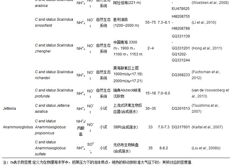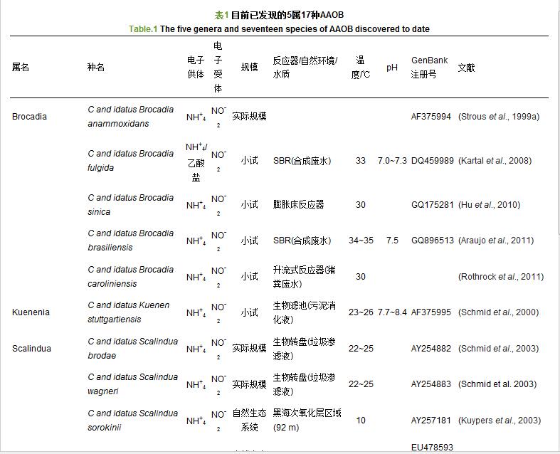 AAOB是一群分支很深的浮霉狀菌.AAOB生長緩慢,在30~40℃條件下,其倍增時間為10~14 d,細胞產率為0.11 g(VSS)/g(NH+4),如果對培養條件進行優化,其倍增時間可縮短至4.8 d,甚至1.8 d.如表 1所示為目前已發現的5屬17種Anammox菌.相關研究表明,AAOB為地球氮循環做出了巨大貢獻,目前已在自然環境和人工環境中發現了大量AAOB的存在.其中厭氧的自然生態系統包括:海洋沉積物和海洋水體、淡水沉積物和淡水水體、紅樹林地區(以及陸地生態系統等.而在人工生態系統中包括:污水處理廠、海洋循環水產養殖系統、垃圾滲濾液處理系統.此外,人們以各種環境中發現的AAOB作為基礎,將其引入污水處理系統,循序漸進地對AAOB進行馴化培養以處理各類廢水,包括實驗室規模、中試規模及實際規模的污泥消化液、垃圾滲濾液、焦化廢水、味精廢水、養豬廢水(以及制藥廢水等.