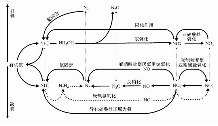 生物處理法作為19 世紀末廢水處理新型技術,與物化處理法相比具有處理費用低,不會對環境造成二次污染等優點.因此,生物處理法至今已成為世界各國污水二、三級處理的主要手段.眾所周知氮元素可在相應微生物的作用下轉化成各種氧化態和化學形式(目前已知的生物氮循環途徑如 圖 1所示),因此在污水生物脫氮處理中衍生了大量組合工藝.而厭氧氨氧化過程是目前最捷徑的生物脫氮過程,因此被譽為最具前景的污水脫氮工藝.為了更好的將厭氧氨氧化工藝應用到實際規模中,本文著重對厭氧氨氧化菌的發現及其與污水處理中常見細菌的協同與競爭關系進行了詳細的綜述.旨在為厭氧氨氧化工藝在污水生物處理中的應用提供理論依據,并為今后厭氧氨氧化工藝的研究方向提出一些意見.