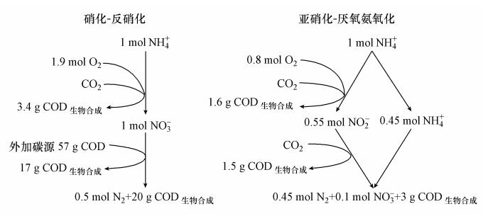 圖 2 硝化-反硝化工藝與亞硝化-厭氧氨氧化工藝的比較