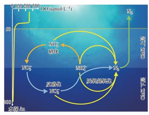 AOB將氨氧化成亞硝酸鹽,為AAOB提供基質,與此同時AAOB也為AOB去除有毒物質(亞硝酸鹽).在自然生態系統中,AOB和AAOB經常共同生長在氧最小區域(oxygen minimum zones,OMZs).目前已在多處海洋的OMZs處發現AOB和AAOB的存在,如智利北部OMZs發現AAOB,且在同一地平線處的秘魯OMZs中發現AOB.如 圖 4所示,為海洋生態系統中AAOB與其他微生物的競爭協同關系.據報道,在海洋50 m深處,AAOB的生物量(高達3000 cell · mL-1)和多樣性最高,而當深度達到300 m時,AAOB的生物量降低到450 cell · mL-1.這是因為深達300 m處的海洋極度缺氧,導致AOB不能生存,因此不能為AAOB提供充足的亞硝酸鹽,所以在300 m深處AAOB活性喪失.同時在黑海的OMZs中也存在著AOB-AAOB互利共存的現象.