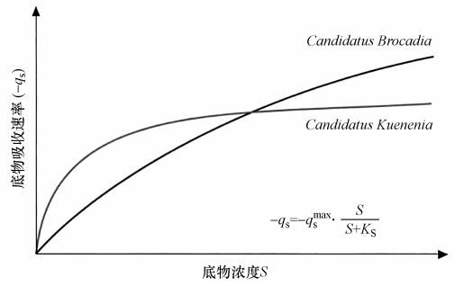 van der Star等,用膜生物反應器富集AAOB時發現,在富集過程中存在種群結構逐漸由原來的C and idatus Brocadia轉變為C and idatus Kuenenia的現象.他們認為C and idatus Brocadia的繁殖策略屬于r-策略,而C and idatus Kuenenia則屬于K-策略. 圖 3為C and idatus Kuenenia與C and idatus Brocadia的競爭曲線,其中C and idatus Kuenenia的亞硝酸鹽半飽和常數KS=0.2~0.3 μmol · L-1,而C and idatus Brocadia的亞硝酸鹽半飽和常數KS≈5 μmol · L-1.因此C and idatus Kuenenia較C and idatus Brocadia生長緩慢,所以在底物濃度較低的情況下,C and idatus Kuenenia占主導作用,相反在底物濃度較高的情況下,C and idatus Brocadia占主導作用.因此,對于污水處理系統的高效運行來說,C and idatus Brocadia可能是很好的選擇.而對于處理低濃度廢水C and idatus Kuenenia則更為合適.