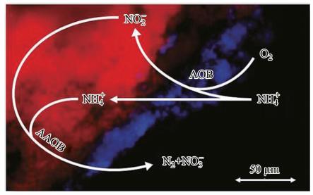 圖 5 AAOB與AOB的空間協同作用示意圖(背景為顆粒污泥切片熒光原位雜交(fluorescence in situ hybridization,FISH)圖片; 其中AAOB探針AMX368用Cy3標記(紅色),AOB探針NSO190、NOS1225用Cy5標記(藍色),NOB探針Ntspa662、NIT1035用Fluos標記(綠色))