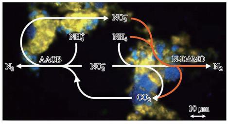 圖 7 AAOB與N-DAMO的競爭與協同作用示意圖(背景為熒光原位雜交(fluorescence in situ hybridization,FISH)圖片; 其中AAOB探針AMX368用Cy5標記(藍色),N-DAMO探針DBACT1027用Cy3標記(黃色))
