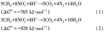 據報道氨、溶解性甲烷、亞硝酸鹽(硝酸鹽)通常共存于缺氧生態環境中.而根據化學計量反應式(1)(2),吉布斯自由能變皆小于零,說明反應可自發正向進行,因此可以推測自然界中存在以NO-2和NO-3為電子受體的厭氧甲烷氧化過程.但經過長時間的調查和研究都未曾在自然界中尋其蹤跡.直至1991年,Smith等利用原位自然梯度示蹤實驗在受污染的地下水環境中發現了厭氧甲烷氧化耦合反硝化的現象,但一直未能獲得其富集培養物.直至2006年Raghoebarsing 等,用Twentekanaal河的缺氧沉積物作為接種污泥,在實驗室條件下獲得了以硝態氮作為電子受體的厭氧甲烷氧化富集培養物,并將該過程命名為反硝化型甲烷厭氧氧化(Denitrification-dependent anaerobic methane oxidation,DAMO). 值得注意的是,當系統中同時存在NO-2和NO-3時,反硝化型厭氧甲烷氧化過程優先利用亞硝酸鹽作為電子受體,因此又將該過程稱為依賴亞硝酸鹽型的厭氧甲烷氧化(nitrite-dependent anaerobic methane oxidation,N-DAMO).