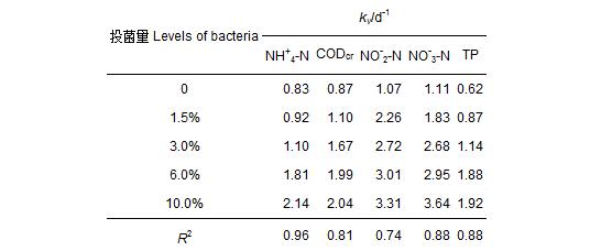 體積去除速率常數kv的大小代表著污染物降解速率的大小,在水力停留時間10 d內,Pseudomonas flava WD-3對各污染物有著較大的降解速率,且隨著投菌量的增加,其對各污染物的降解速率也隨著增加,各kv的R2分別達0.96、0.81、0.74、0.88和0.88.具體參見污水寶商城資料或http://www.bnynw.com更多相關技術文檔。