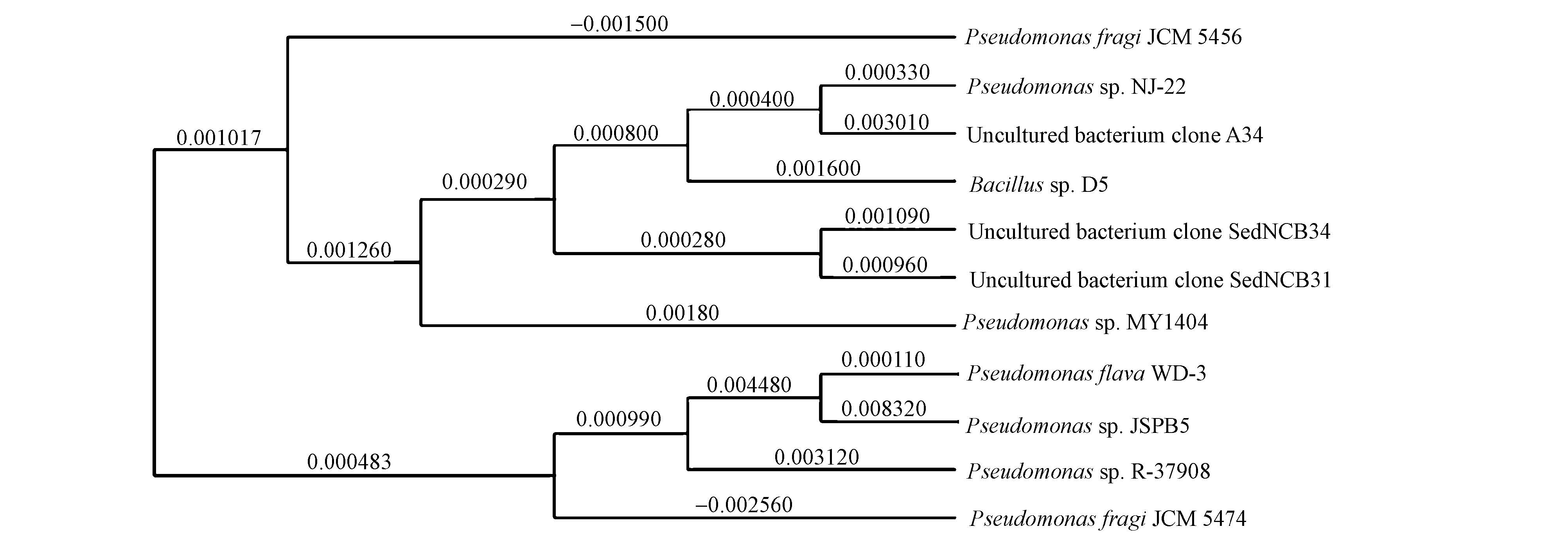 在8 ℃下培養菌株E表現為濕潤、邊緣整齊、半透明的圓形乳白色菌落,革蘭氏染色試驗菌株E呈陰性,顯微鏡下觀察為桿狀,葡萄糖氧化發酵試驗產酸不產氣;蔗糖氧化發酵試驗產酸不產氣;檸檬酸鹽試驗陽性;明膠水解試驗陽性;氧化酶試驗陽性;淀粉水解試驗陰性;甲基紅(MR)試驗陽性;過氧化氫酶試驗陽性;產H2S試驗陽性;吲哚試驗陽性.經鑒定菌株E的16S rDNA特異序列為1424 bp,對該序列進行BLAST檢索,應用Clustal W和PHYLIP軟件分析并構建了進化樹,見圖 2.從分析結果可知,菌株E與假單胞菌同源性高達100%.因此結合該菌株的形態特征及生理生化反應特性,可初步鑒定菌株E為黃假單胞菌(Pseudomonas flava),命名為Pseudomonas flava WD-3.