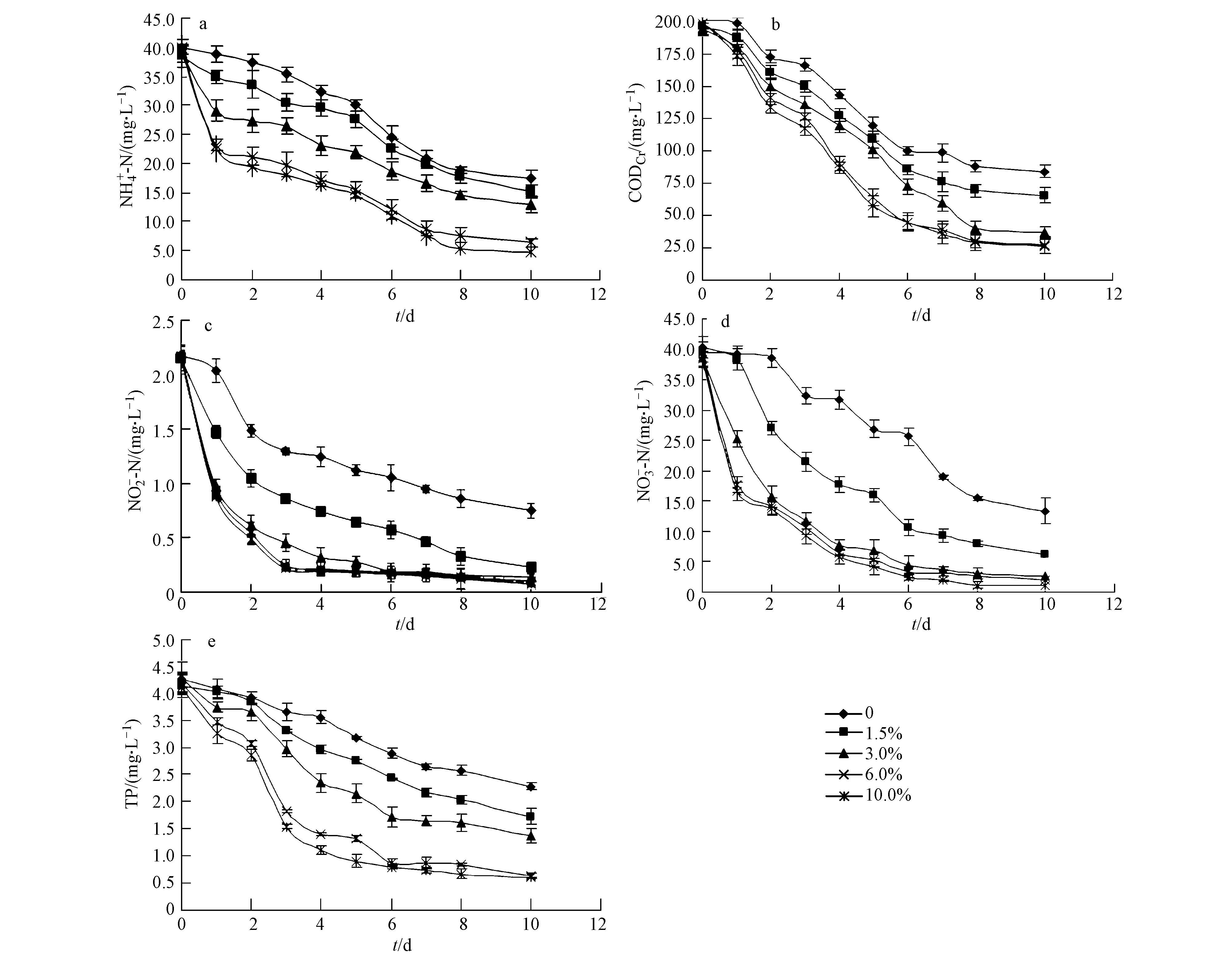 在水力停留時間10 d內,水溫為6~8 ℃時,不同接種量對復合垂直流濕地中污水的氨氮、CODCr、亞硝酸鹽氮、硝酸鹽氮和總磷去除效果如圖 3.