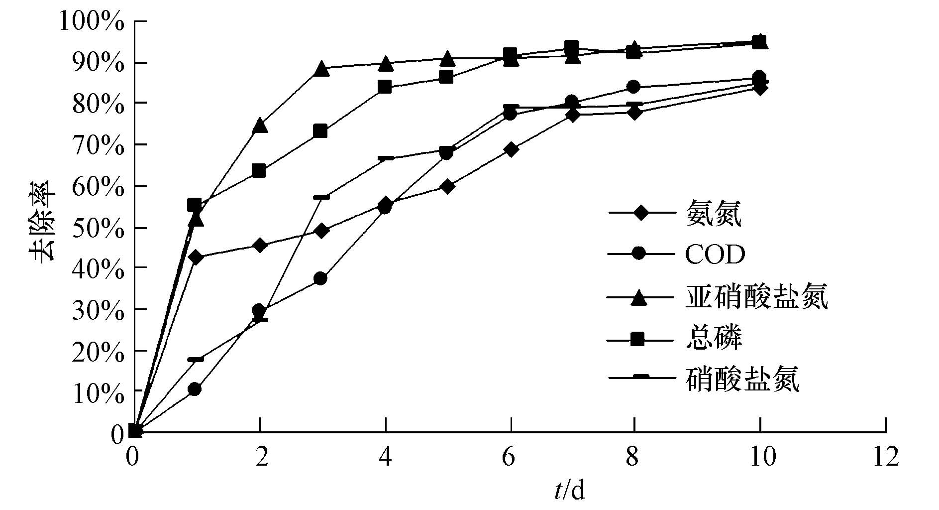 圖 4 NH+4-N、CODCr、NO-2-N、NO-3-N、TP的去除率隨時間的變化