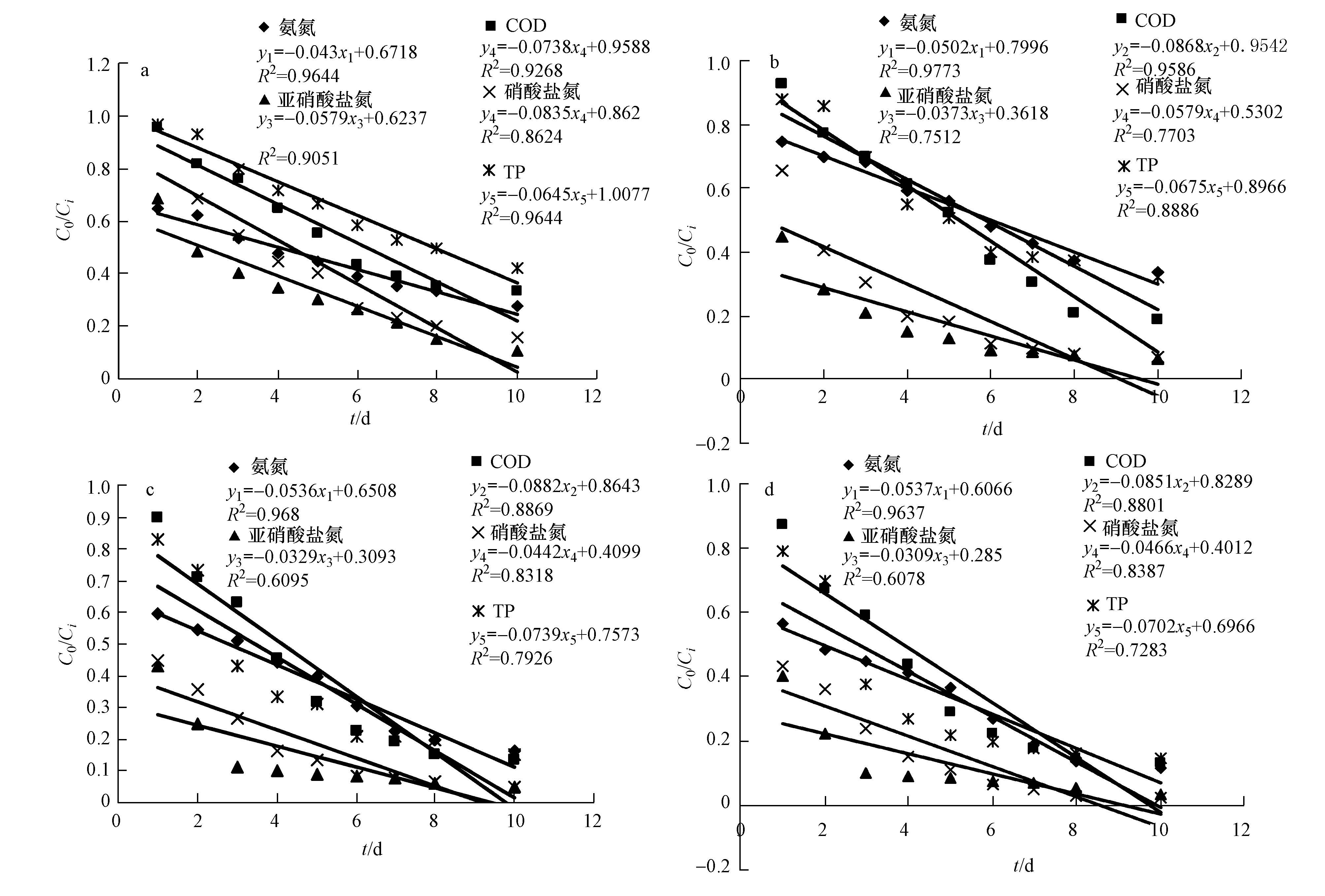 式(1)~(2)中,kv為污染物體積去除速率常數(d-1);Ci為進水濃度(mg · L-1);C0為出水濃度(mg · L-1);t : 水力停留時間(d).