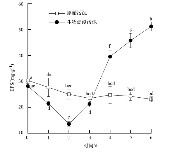 污泥中胞外聚合物(EPS)主要來源于微生物細胞的分泌和破裂釋放的內含物.而在生物瀝浸過程中由于pH的劇烈變化,導致了生物瀝浸污泥中微生物菌群的劇烈變化,這就使得生物瀝浸污泥中的EPS含量從初始的28.18 mg · g-1(以VSS計,下同)顯著下降至第2 d的13.53 mg · g-1,然而過長時間的生物瀝浸處理使得污泥EPS的含量隨后顯著增加至第6 d的51.22 mg · g-1;原始污泥中EPS含量變化較為平緩,僅由初始的30.40 mg · g-1下降至第2 d的25.05 mg · g-1,隨后基本保持穩定(圖 2).在生物瀝浸的前2 d內,污泥中EPS含量顯著下降可能是由于在酸化作用下大量的EPS從污泥顆粒表面脫落和分解.再者,自養型硫桿菌本身分泌的EPS就比污泥中異養菌少得多,當硫桿菌逐漸占優勢時,表現出污泥EPS就會明顯減少.但過長時間的生物瀝浸處理會使得污泥pH值長期處于2以下,此時會導致污泥中存活的微生物(主要為硫桿菌)分泌大量的EPS以保護自身細胞免受傷害,導致生物瀝浸后期污泥EPS含量的顯著增加.