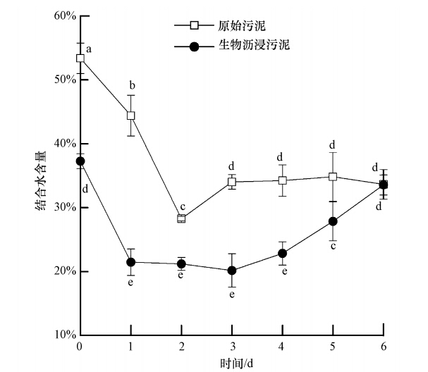 污泥中的水分分布對污泥脫水性能具有直接的影響,而其中結合水含量是影響污泥脫水性能的決定性因素,這主要是由于相對自由水而言結合水的去除需要消耗較多的能.因此,測定污泥中結合水含量可以直接反映污泥的脫水性能.如圖 3所示,在生物瀝浸處理中,污泥結合水含量從初始的37.28%顯著下降至第2 d的21.20%,然而長時間的生物瀝浸反而使污泥結合水含量增加至第6 d的33.57%;而對照原始污泥在5 d的處理時間內其結合水含量均是顯著高于生物瀝浸污泥中的結合水含量.