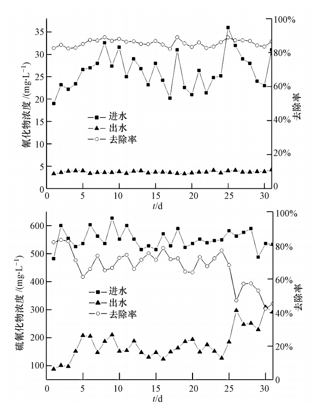文獻報道,氰化物和硫氰化物都可以在好氧和厭氧條件下被微生物降解,但氰化物在厭氧條件下降解速率較慢,硫氰化物的厭氧降解一般是在硝酸鹽存在的條件下進行的.圖 2為氰化物和硫氰化物在一級好氧流化床的運行數據,可以看出,在HRT為40 h、溶解氧控制在1~3 mg · L-1的情況下,一級好氧流化床氰化物和硫氰化物進水濃度為19.0~36.1 mg · L-1和482.4~672.1 mg · L-1,出水濃度分別為3.3~4.2 mg · L-1和87.8~309.1 mg · L-1,去除率達85.6%和67.5%.在O/H/O生物處理系統中,設計一級好氧流化床以去除酚類等有機污染物為主,在酚類進水濃度在902~1100 mg · L-1 的情況下,出水揮發酚平均濃度為11.6 mg · L-1,平均去除負荷為0.54 kg · m-3 · d-1. 因此,一級好氧流化床可實現氰化物、硫氰化物與酚類的同步降解,并且酚類的降解優先.