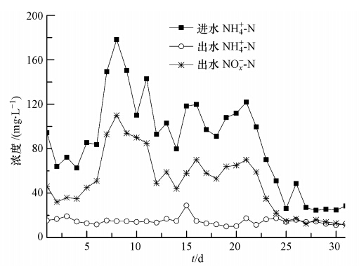 一級好氧流化床對有機碳源的充分降解保證了二級好氧流化床內競爭性碳源大量減少,為硝化細菌的培養和選擇性增殖提供了良好的環境.圖 3為二級好氧段NH+4-N、NO-x-N的濃度變化.二級好氧流化床氨氮進水平均濃度為85.9 mg · L-1,出水NO-x-N平均濃度為47.7 mg · L-1,表現出良好的硝化效果.該階段主要的硝化產物為NO-3-N,但從第25 d開始,硝化產物以NO-2-N為主,結合其他污染物指標進行分析,發現此時二級好氧進水中硫氰化物濃度急劇升高,并維持在200 mg · L-1以上,硫氰化物對完全硝化過程有抑制作用,導致亞硝氮的積累.具體參見污水寶商城資料或http://www.bnynw.com更多相關技術文檔。