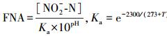 在實際的污水處理中,亞硝酸鹽作為硝化和反硝化的中間產物廣泛存在于污水的脫氮除磷系統中,且在一定條件下能夠積累,如DO、溫度、pH的變化,以及高濃度的氨氮、硝態氮等.Zeng等(研究發現,亞硝酸鹽在傳統的A/O工藝中積累量可高達20 mg · L-1.亞硝酸鹽積累濃度過高會導致EBPR崩潰.Saito等報道2 mg · L-1 NO-2-N已對PAOs的好氧吸磷造成嚴重的抑制,而Zeng等報道10 mg · L-1 NO-2-N未對磷的吸收和釋放產生抑制.以往研究中對微生物起抑制作用的亞硝酸鹽濃度不盡相同,甚至差別很大,這可能與污泥種類、進水成分及反應器的運行條件有關.亞硝酸鹽對污水處理廠中微生物的代謝具有嚴重的抑制作用,包括EBPR中起主要作用的PAOs.亞硝酸鹽能夠抑制PAOs的好氧吸磷、底物氧化磷酸化、物質主動運輸等作用,從而對EBPR造成嚴重影響的研究表明,PAOs的同化作用(微生物的生長、磷的吸收、糖原質的補給)和異化作用(PHA的氧化)均不同程度地受到亞硝酸鹽的影響,且異化作用受抑制程度相對同化作用要小.近期研究發現,在亞硝酸鹽的水溶液中真正對微生物代謝起抑制作用的為游離亞硝酸(Free Nitrous Acid,FNA),FNA為亞硝酸鹽的的質子化形態,它能夠自由地穿過細胞膜.通過嚴格控制pH等外界條件證實,好氧吸磷的真正抑制成分是亞硝酸鹽的質子化形態(即FNA).FNA的濃度與溶液中亞硝酸鹽的濃度、溫度和pH密切相關,其關系可通過以下公式表示: